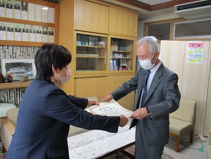 松浦教育長様より笹部様に表彰状が手渡され ました。 |